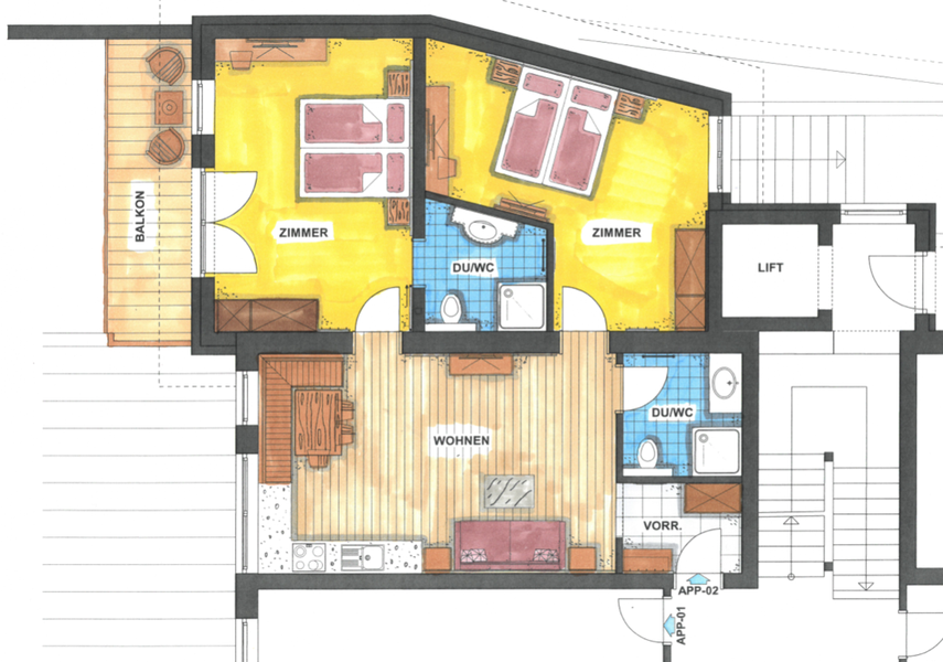 Zur Ausstattung gehören zudem WLAN, TV und Telefon. Auf dem Balkon mit Tisch und Sesseln können Sie die frische Luft genießen. Bettwäsche und Handtücher werden gestellt, und ein Ski- und Schuhraum steht ebenfalls bereit – perfekt für Ihren Winterurlaub.